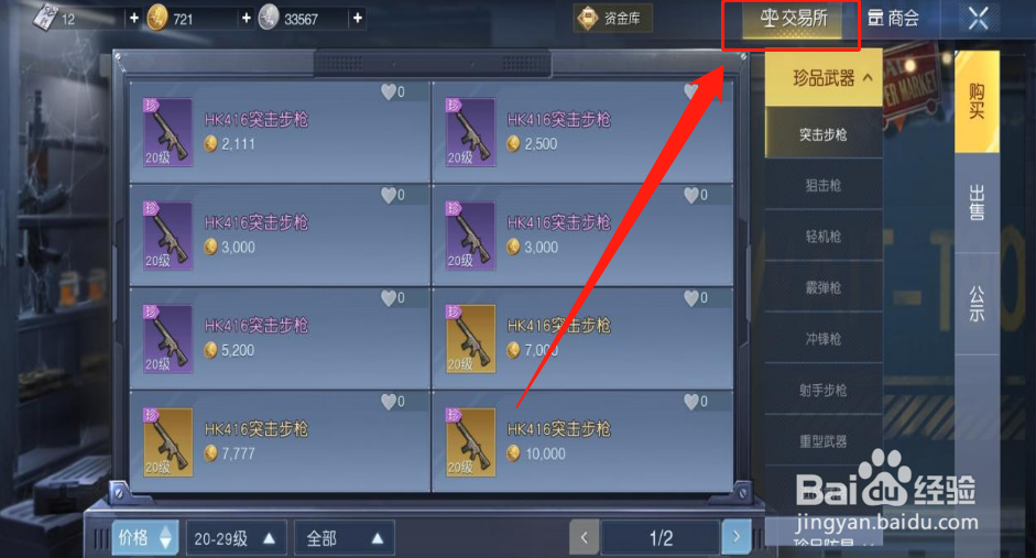 3、交易所页面,选择打开“珍品武器”。
