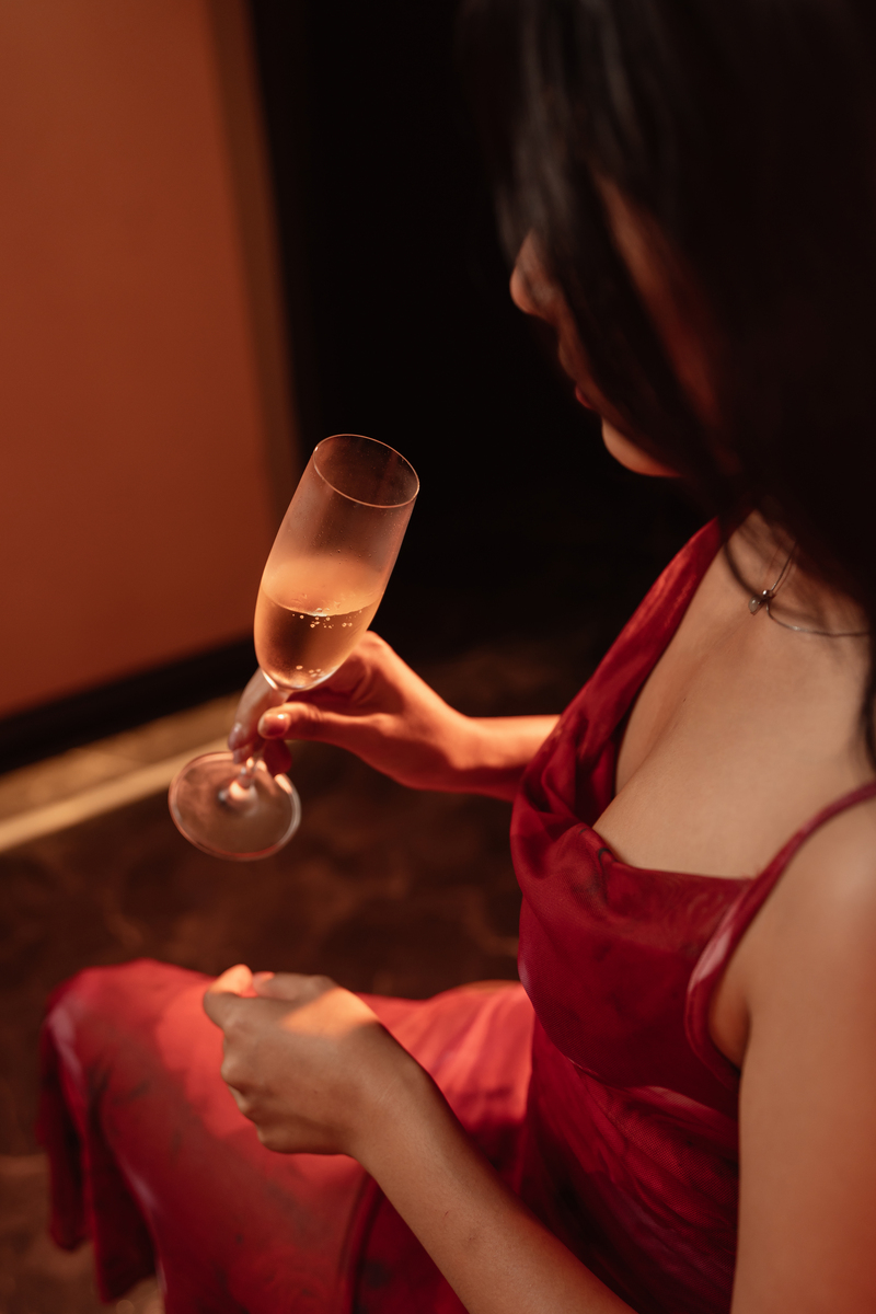 短袖刚好露出手臂最细的位置,搭配一杯白葡萄酒整个人都慵懒又性感