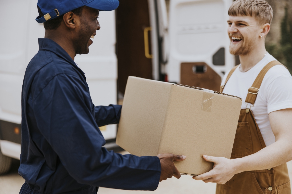 物流人员快递员抱着快递纸箱微笑送货上门服务